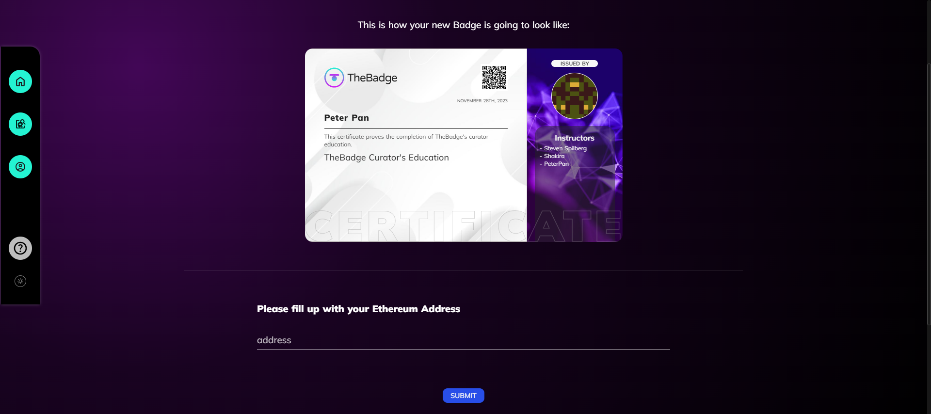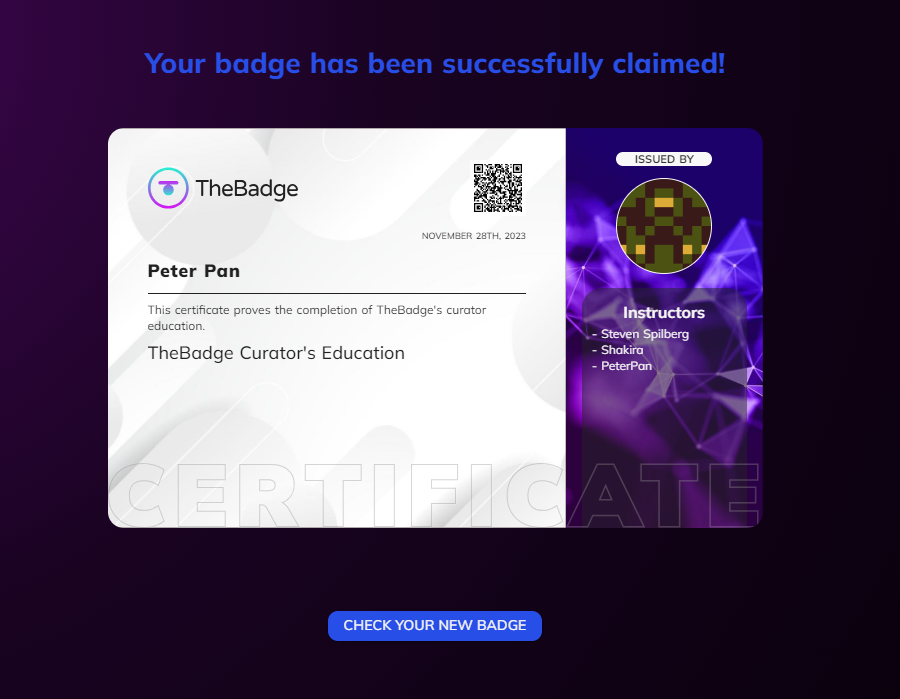 These badges, diplomas, or certifications are backed by a company that uses TheBadge's Dapp to issue and distribute them. This means that in order to receive a third-party badge or certificate you must first be in direct contact with the company.