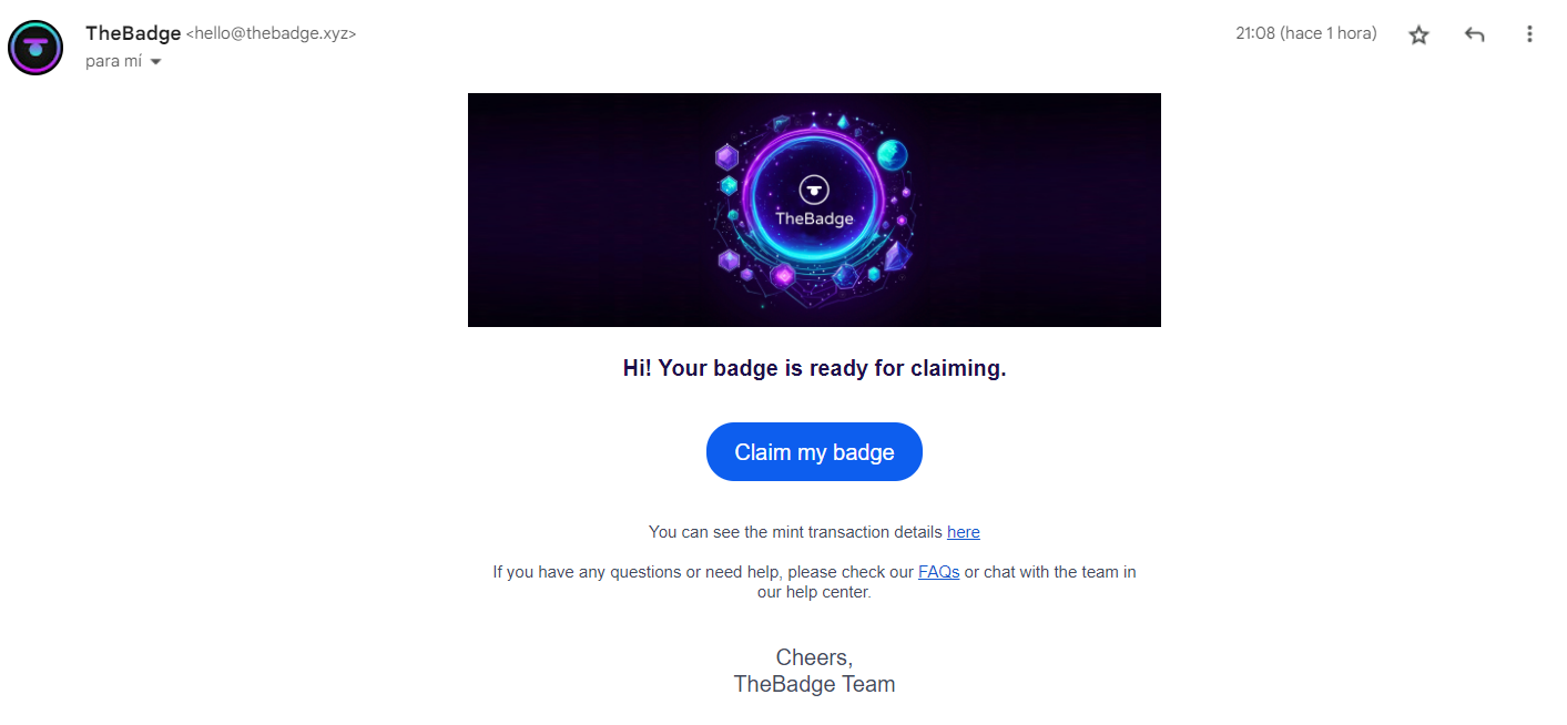 Go to your email inbox and look for an email coming from TheBadge ([email protected])